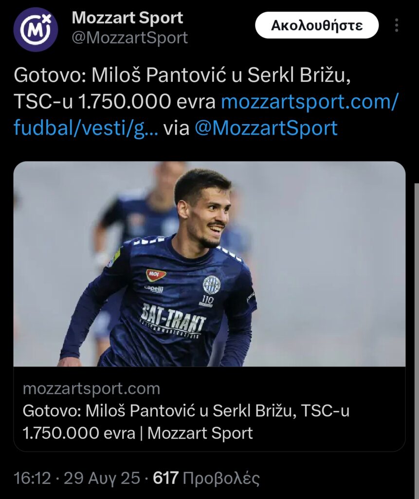 «Οριστικό: Ο Μίλος Πάντοβιτς παρέδωσε τον εξοπλισμό του συλλόγου από την Μπάτσκα Τόπολα, καθώς πιθανότατα από αύριο θα γίνει επίσημα παίκτης της Σερκλ Μπριζ.