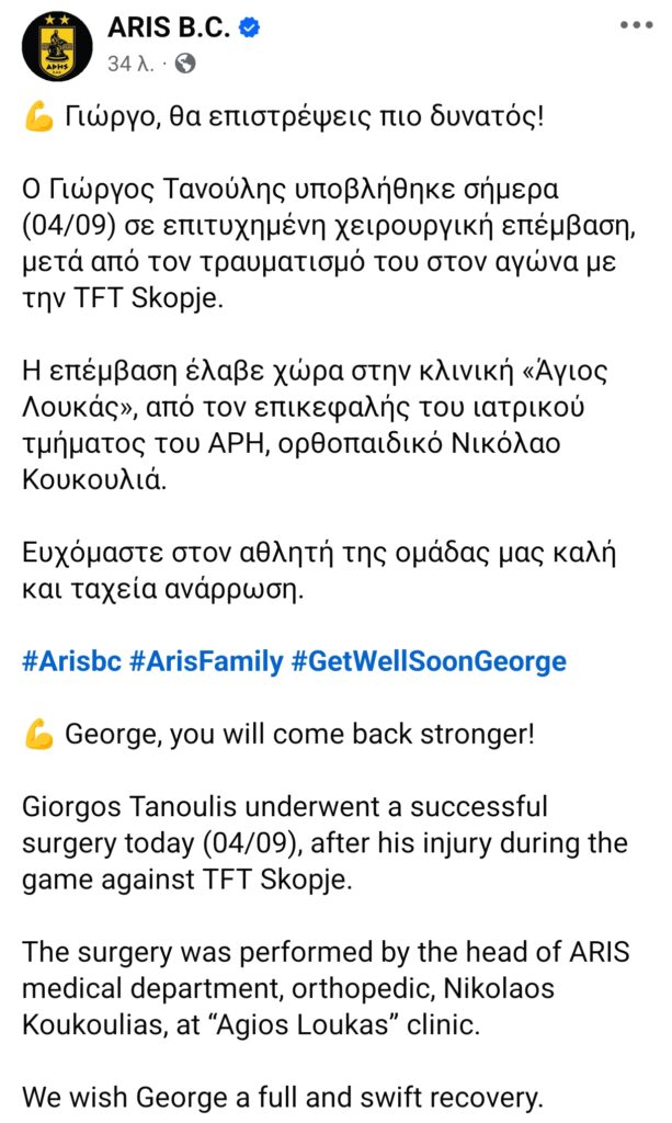 Η επέμβαση έλαβε χώρα στην κλινική “Άγιος Λουκάς”, από τον επικεφαλής του ιατρικού τμήματος του ΑΡΗ, ορθοπαιδικό Νικόλαο Κουκουλιά. Ευχόμαστε στον αθλητή της ομάδας μας καλή και ταχεία ανάρρωση».
