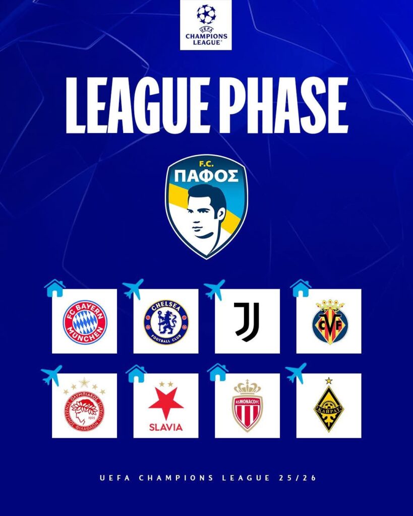 Η Πάφος θα αντιμετωπίσει τις: Μπάγερν Μονάχου, Τσέλσι, Βιγιαρεάλ, Γιουβέντους, Σλάβια Πράγας, Ολυμπιακός, Μονακό και Καϊράτ Αλμάτι.