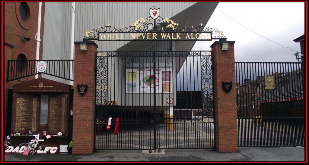 Ψηλά στο έμβλημα απεικονίζονται οι πύλες του Shankly.Οι πύλες βρίσκονται έξω από το γήπεδο της ομάδας ( το Άνφιλντ ) και είναι αφιερωμένες στο Σκωτσέζο τεχνικό και θεμελιωτή της «κόκκινης αυτοκρατορίας. Από κάτω η φράση: “You Never Walk Alone” από τον γνωστό ύμνο της ομάδας.