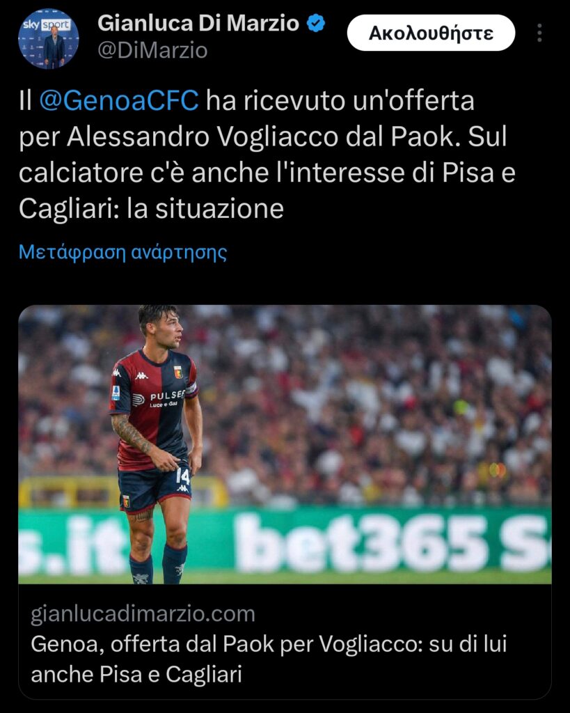 Συγκεκριμένα, οι «ασπρόμαυροι» φαίνεται να ενδιαφέρονται για τον κεντρικό αμυντικό της Τζένοα, Αλεσάντρο Βολιάκο, σύμφωνα με τον Ιταλό δημοσιογράφο Τζιανλούκα Ντι Μάρτζιο.