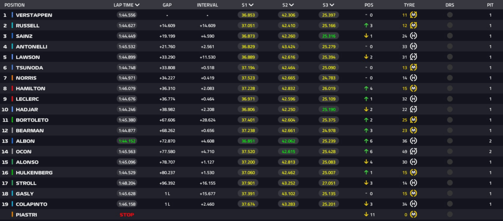 Προς το τέλος του αγώνα στους γύρους 35-40 και ενώ οι περισσότεροι είχαν κάνει την αλλαγή των ελαστικών οι Verstappen, Russell, Tsunoda, Norris μπήκαν όσο αργότερα μπορούσαν για να έχουν φρέσκια μέση γόμα και να μπορέσουν να επιτεθούν σε περίπτωση που βγουν σε θέση που δεν ήθελαν. Ο Verstappen με την αλλαγή έμεινε μπροστά και δεν κοίταξε καθόλου πίσω ενώ ο Russell κέρδισε θέση από τον Sainz με το overcut και είχε ρυθμό για να αμυνθεί. Η βροχή δεν ήρθε ποτέ με τον Max να κάνει άλλη μια σπουδαία εμφάνιση και τον Russell να παίρνει την 2η θέση και o Carlos Sainz πήρε το πρώτο του βάθρο με την Williams στην 3η θέση κάνοντας ένα εξαιρετικό Σαββατοκύριακο ενώ ο Antonelli τερμάτισε 4ος ενώ ο Lawson με μια εξαιρετική εμφάνιση πήρε την 5η θέση.